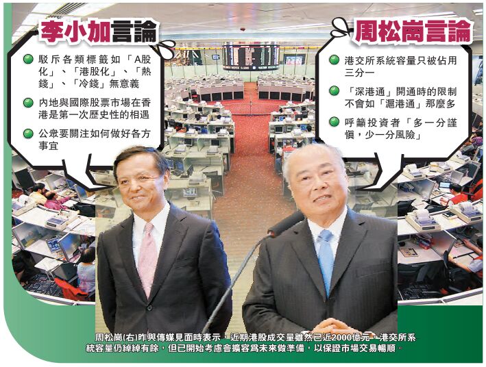 港交所行政總裁李小加早前在臺灣時提及,港交所將考慮擴容系統,至可承受成交峰值為5000至6000億元。周松崗昨日則表示,近期港股成交量由每日600至700億元上升至今日近2000億元,但港交所系統容量僅被占用三分一。