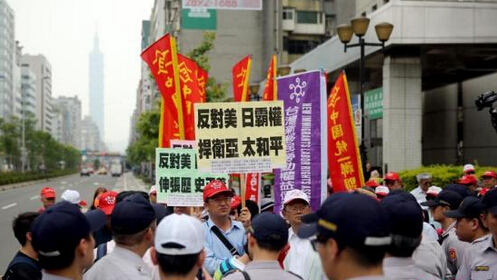 1日上午,兩岸和平發展論壇、勞動黨、勞動人權協會、臺灣地區政治受難人互助會、夏潮聯合會、中國統一聯盟等多個團體與近百位民眾前往美國在臺協會抗議,遞交相關聲明。過程中,民眾高呼“反對美日侵略同盟”、“反軍購、要福利”等主張。
