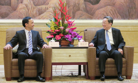 復旦大學行程結束後,朱立倫傍晚6時許和中共中央政治局常委、全國政協主席俞正聲會面。俞正聲說,知道朱立倫祖籍浙江義烏,他自己亦是浙江人,而臺灣絕大部分人籍貫都是大陸,所以就是「兩岸一家親」。