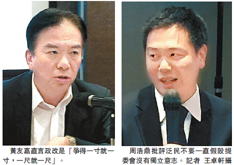 香港青年時事評論員協會昨日下午舉辦「2017得?唔得?」政改論壇。包括黃友嘉、民建聯副主席周浩鼎,泛民立法會議員梁家杰、莫乃光以及前民主黨中委黃成智就立法會應否通過政改各抒己見。