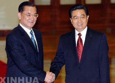 2005年4月29日,時任中共中央總書記胡錦濤在北京人民大會堂會見時任中國國民黨主席連戰。兩人的這次握手,是時隔60年兩黨最高領導人的歷史性握手。 新華社記者 張旭 攝