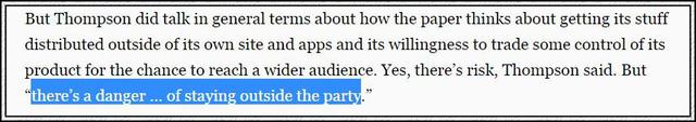 有記者曾在不同場合反複追問 CEO 馬克·湯普生關於 Facebook 的話題,湯普生堅持顧左右而言他。但在扯與 Facebook 無關的一個話題時,這位CEO卻說漏了嘴。他說,哪家媒體承受得起不與 Facebook 合作的代價?他的原話更為經典:參與那個遊戲,有風險(risk),是的。但是,“置身那個派對之外,有危險(danger)。”