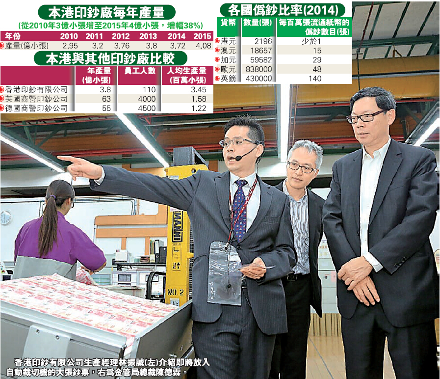 根據2013年資料顯示,本港印鈔廠的人均生產量高達345萬小張,遠高過世界上產量排行第一的英國商營印鈔公司及第二的德國商營印鈔公司(見表)。