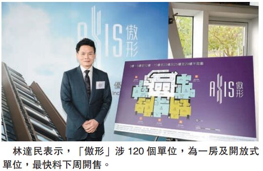 【香港商報訊】恒地(012)馬頭圍項目將命名為「傲形」(Axis),項目料本周公布樓書,最快下周開售。恒地營業(一)部總經理林達民昨表示,「傲形」涉120個單位,為一房及開放式單位,標準樓層一梯五伙,開放式為B及D室,實用面積介乎204至212平方尺,共48個單位;而一房戶設於A、C及E室,實用面積介乎246至282平方尺,共72個單位;所有單位設露臺并選用趟門,同時亦以開放式廚房設計,目標客為新婚夫婦或上車客。項目最快本周公布樓書,預料本周末開放示範單位,下周或公布首批價單,最遲取得入伙紙的關鍵日期料為2017年3月31日。