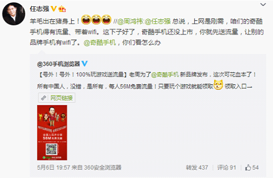 就在業界各方對360手機的名字、功能、售價眾說紛紜之際,周鴻禕卻讓“免費送流量”成為了發布會的主旋律,令人嗅到了關於奇酷手機產品理念的蛛絲馬跡。而在當天的發布會現場,華遠集團總裁、地產界的風雲人物任志強也應邀出席,並同周鴻禕就手機上網的話題相談甚歡。隨後,其不僅與老周在微博上頻頻互動,更轉發了360手機瀏覽器官微發布的活動微博,為初出茅廬的奇酷手機再添了一把火。