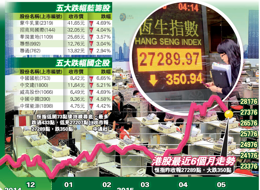 港股自踏入5月份便「入月随俗」未升过,昨日再跌350点,连同4月最后两日,恒生指数已缔六连跌走势,累积跌幅超过1100点。中央严管股票融资,沪综指急跌近2.8%。恒指低开73点后持续寻底,最多跌过433点,低见27207点,收市报27289点,跌350点。国企指数收报13768点,跌228点。