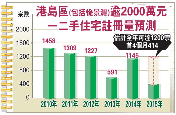 【香港商報網訊】港島物業在剛性需求帶動下持續升溫,據美聯(1200)研究部數據,本年首4個月港島區樓價上升約4.6%,二手住宅註冊金額較去年同期錄得近九成增長。其中逾2000萬元一、二手豪宅受追捧,首4個月註冊量已錄得414宗。美聯高級區域營業董事羅文駒昨表示,在股市向好的因素帶動下,套股換樓需求上升,港島區豪宅市場將持續升溫,預計全年港島逾2000萬元一、二手住宅註冊量達1200宗,或將創3年新高。