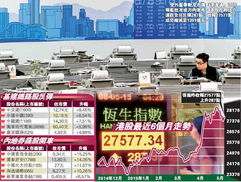 【香港商報网訊】記者伍敏報道:受外圍帶動及市傳「深港通」正待兩監批準或月內宣布,港股昨終止六連跌全日反彈287點,收報27577點,成交縮減至1391億元。總結本周港股累挫555點;國指亦跌381點報14049點。港股本周日均成交約1586億元,短線28000點阻力位有待成交配合下突破。昨基建鐵路及券商股份再次受捧,合併概念則蔓延至航空股。