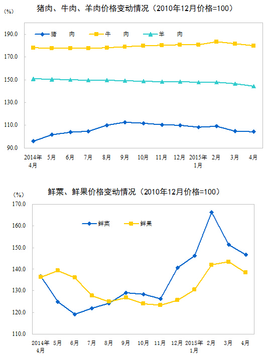 2015年4月份,全國居民消費價格總水平同比上漲1.5%。其中,城市上漲1.6%,農村上漲1.3%;食品價格上漲2.7%,非食品價格上漲0.9%;消費品價格上漲1.3%,服務價格上漲2.1%。1-4月平均,全國居民消費價格總水平比去年同期上漲1.3%。