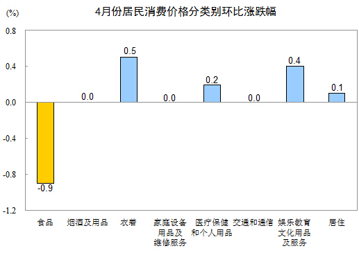 4月份,全國居民消費價格總水平環比下降0.2%。其中,城市下降0.2%,農村下降0.3%;食品價格下降0.9%,非食品價格上漲0.2%;消費品價格下降0.4%,服務價格上漲0.3%。