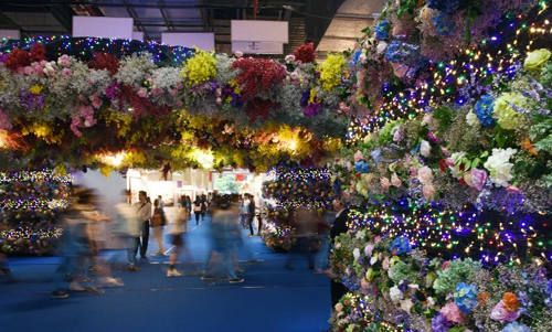 5月8日,参观者在台北新艺术博览会上欣赏花艺师齐云设计的“空中花园”装置艺术。