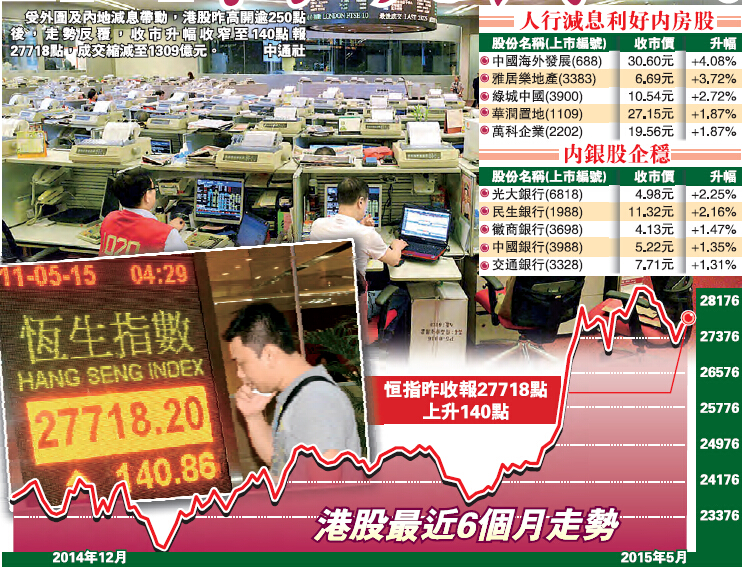 【香港商報网訊】記者伍敏報道:受外圍及內地減息帶動,港股昨高開逾250點後,走勢反覆,收市升幅收窄至140點報27718點,成交1309億元,騰訊(700)績前獨力貢獻大市約100點。A股滬綜指經過早前調整過後則報復式反彈逾3%。市場人士認為,港匯近期偏軟及港股成交減少反映港股現處調整期,惟內地減息周期未完,待投資信心及氣氛逐步好轉後,相信會繼續穩步向上。而減息及降準等刺激政策的成效,估計第二季度經濟方可浮現。