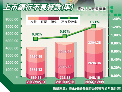 除了利潤增速放緩外,值得留意的是內銀資產質素問題。安永報告顯示,截至去年底,21家上市的內銀不良貸款餘額達6748.8億元,比去年底增加1892.64億元,加權平均不良貸款率從2013年底的0.97%,上升至1.21%;至於今年首季16間在A股上市的銀行,至3月底,不良貸款率較去年底增加0.11個百分點至1.33%。