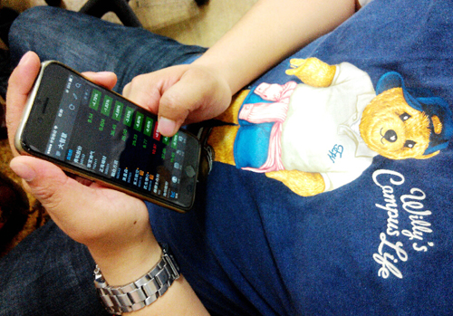 图为福州一股民在用手机炒股。随着股市行情不断上涨,许多股民都在手机上安装了炒股软件,时刻关注。
