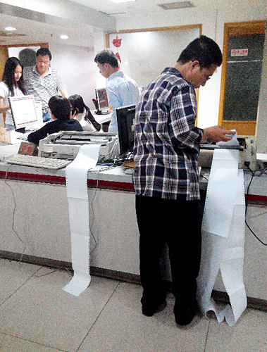 圖為5月13日,福州一證券交易營業網點,股民在打印長長的交割列表。