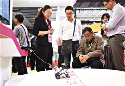 昨日,一位頭發蒼白的市民戴上了體驗機,在展台內現場用“意念”讓腦控車完成了前進、後退、擺臂等動作。