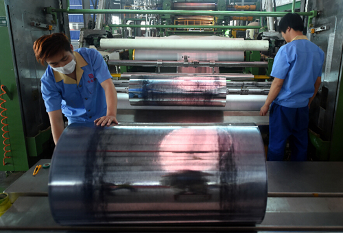 5月15日,廊坊華康塑業有限公司工人在從德國引進的PVC壓延機生產線上貼合底料。