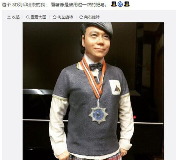 中新網5月18日電 今日下午,蔡康永通過微博曬出“3D打印版自己”,並留言:“這個3D列印(打印)出來的我,看著像是被用過一次的肥皂。”