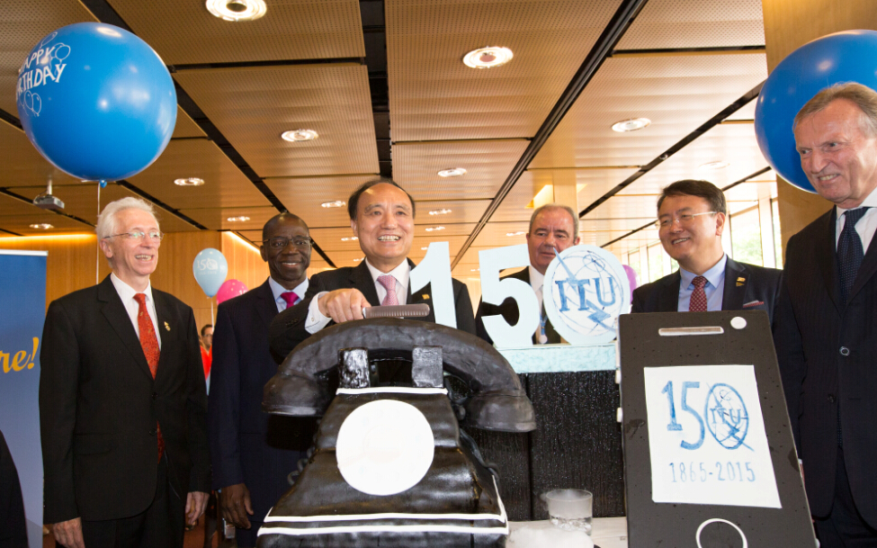 5月17日,在瑞士日內瓦,國際電信聯盟秘書長趙厚麟(左三)等嘉賓在聯盟成立150周年慶典上一起切蛋糕。