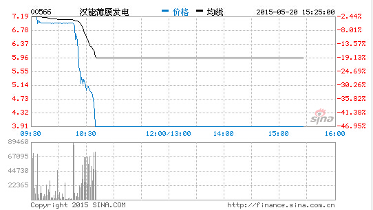 港交所上市公司汉能薄膜发电在今早10时15分突然跳崖式下跌,截止至中午,暴跌46.95%,报3.91港元,成交1.75亿股,成交额10.51亿港元。公司公告10时40分起短暂停牌。