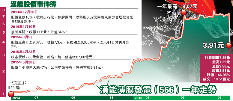 自去年底來,漢能打著環保旗幟,以國家政策護航脫穎而出。去年11月滬港通開通後,漢能薄膜發電成為最受追捧的港股上市公司之一,內地資金更對其情有獨鍾。今年2月和3月,通過滬港通買入其股份的資金高達30億元,市值一度媲美港交所及和黃。漢能薄膜發電半年內股價翻了7倍,最高曾見9.07元,今年以來漲幅累計亦達162%。惟好景不長,昨日在開盤後短短一個鐘便吞嚥接近今年全部升幅。