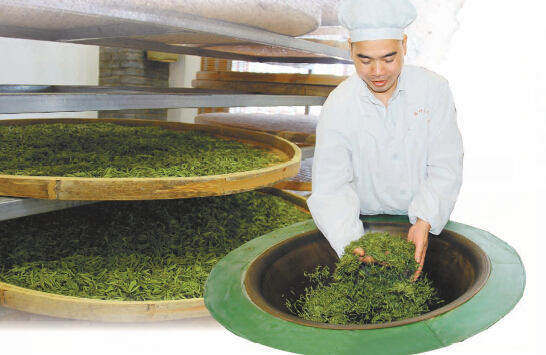 曬青。狗牯腦茶有「兩次殺青」和「兩次揉捻」的特殊工藝,圖為製茶師傅在殺青。