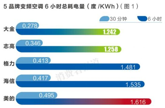 2015年3月,《消費者報道》送檢了格力、美的、海信、志高和大金等5品牌的1.5匹、3級能效變頻空調至第三方檢測機構,模擬消費者日常使用方式,對5款變頻空調在6小時內的溫度變化和耗電量進行測試。