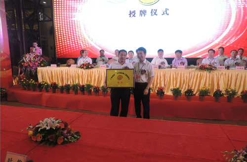 廣東省湖北商會執行會長劉再忠(右)向新當選的會長郭從敏(左)授牌。