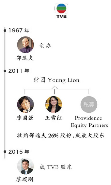 Young Lion財團由“殼王”陳國強、臺灣女首富王雪紅和私募基金Providence Equity Partners組成,于2011年收購了TVB創始人邵逸夫持有的26%的股份,成為TVB單一最大股東。
