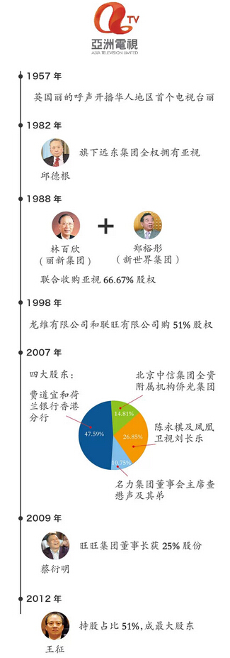 2009年,臺灣首富、旺旺集團董事長蔡衍明成為亞視最大股東。2010年,亞視股權比例變成了如下局面:內地地產商王征透過其堂姐夫、“建材大王”黃炳均持股51%,蔡衍明和香港興業主席查懋聲等人則共同持有48%。