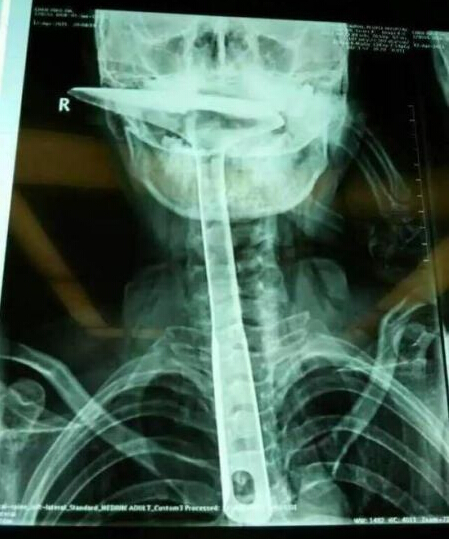 南都訊 記者肖佩佩 炒菜用的鍋鏟,長達30公分,活生生插進自己的食道,只剩下鏟勺露在嘴巴外面,整個食道嚴重受損。醫生都不禁感嘆:“這真的是50年難遇的病例。”