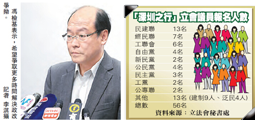 立法会议员与中央官员深圳会面之行昨日截止报名,立法会秘书处表示,有56名议员已表示报名参加,建制派除医学界梁家骝未有回复,以及自由党张宇人表明不出席外,其馀41人均表示全数出席。泛民主派则有15人,包括民主党单仲偕、黄碧云、胡志伟;公民党梁家杰、汤家骅、郭荣铿、郭家麒;工党何秀兰、张国柱;公共专业联盟莫乃光、梁继昌;民协冯检基;另教育界叶建源、卫生服务界李国麟及社民连梁国雄。