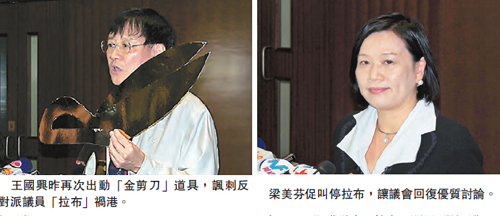 工联会议员王国兴昨日再次出动「金剪刀」道具,讽刺反对派只顾「拉布」。他直斥泛民4年来的「拉布」恶行,浪费公帑逾26亿元,而且浪费议会时间,为社会带来困扰;他亦称「拉布」会令政府的纾困措施如公屋免租一个月等,未必如期推行;他更称,近期因为「拉布」,需要议员不时同时连走数个委员会会议,大大影响议会议事质素。
