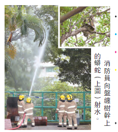 【香港商報網訊】記者萬家成報道:香港仔鴨昪洲西恏有大蟒蛇出沒,昨晨有居民發現一條3米長大蟒蛇在恏內休憩公園爬上大樹,盤纏樹干,警方接報召來「蛇王」協助,由於蟒蛇身處高位無法接近,消防員向蟒蛇射水,待其墮下地上由「蛇王」活捉。