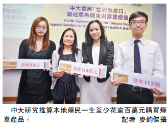 中大醫學院藥劑學院副教授李詠恩昨日表示,比較每年亞太地區吸煙者購買煙草產品的費用,香港僅次澳洲及新加坡,排名第三。煙民如每日吸1包煙,1年要花2萬元,每日吸3包煙,相等於1年大學學費及住宿支出,或是7張香港來回瑞士機票。
