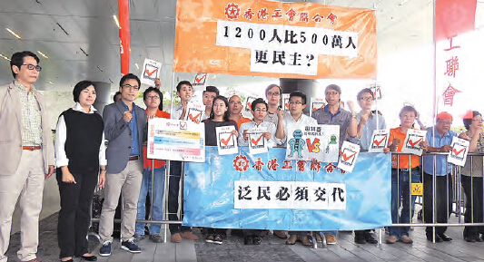 工聯會昨日再度就政改請願,約20名代表昨日到立法會外,高舉寫上「2017我要投票選特首」、「1200人選委比500萬選民更民主?」等字句的紙牌,要求立法會議員通過政改方案,讓500萬合資格選民得以在2017年,可以一人一票選特首。