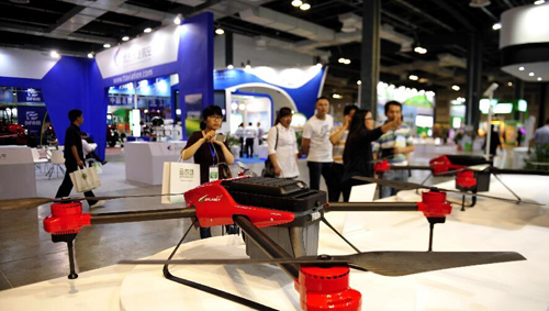 这是5月27日在2015第四届国际现代农业博览会上拍摄的参展无人机。当日,2015第四届国际现代农业博览会在上海世博展览馆开幕。多种无人机在此次博览会上亮相,吸引了众多参观者。 新华社记者 张建松 摄