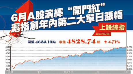 【香港商報網訊】在經歷上周的暴跌之后,股市周一現報復性反彈,在6月份的第一個交易日順利實現開門紅。截至收盤,滬指報4828.74點,漲4.71%,成交9344.56億元;深成指報16917.53點,漲5.07%,成交8751.36億元;創業板報3718.75點,漲4.97%;中小板報11500.14點,漲4.81%。