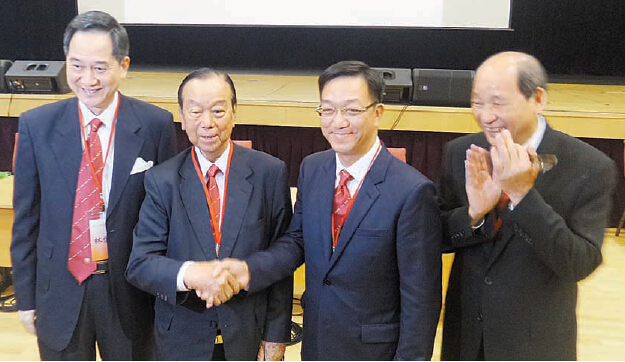 劉皇發(左二)祝賀兒子劉業強(右二)當選新一屆鄉議局主席,張學明(右一)與林偉強(左一)二人順利連任副主席。