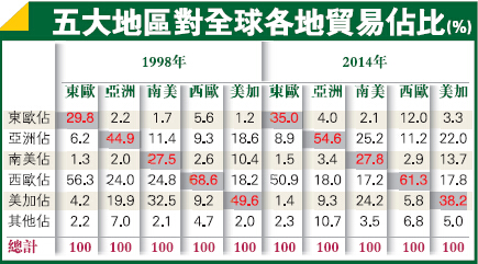 跨洲份貿易逐漸式微,取而代之就是區域性的發展。表中可見,以東歐為例,同區貿易佔比(佔區內全球貿易額)由1998年的30%上升至2014年的35%,亞洲區更由45%增至55%,南美則維持在27%左右。當中,亞洲區內貿易頻繁程度(55%)僅次於西歐的61%。歐洲區內貿易的連動或解釋了歐元為何誕生,而亞洲區則以新興市場為主,區內所展示的生產及消費增長潛力,對不少國家而言實在是一大肥肉。