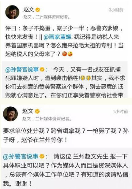 5月27日,烟台市公安局莱山分局民警沈成磊在抓捕盗窃汽车的犯罪嫌疑人时,不幸被凶残的歹徒用刀刺死。但是,针对勇斗歹徒而壮烈牺牲的人民警察,微博、微信认证为“兰州媒体资深记者赵文”的人,评论是“条子不捣蛋,案子少一半;恶警充爹娘,快快来发丧!”而且针对网民的质疑,赵文回应:“要求单位处分我?跨省缉拿我?一枪毙了我?孙子呀,赵爷在兰州等着你!”。