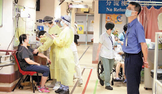 廣華醫院急症室醫護人員穿著保護衣,求診者均戴口罩,嚴密防範新沙士。