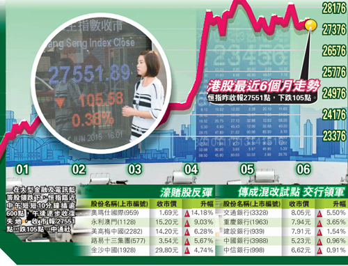 港股跟随A股大玩过山车,在大型金融及电讯蓝筹股领跌下,恒指临近中午短短10分钟插逾600点,午后逐步收復失地,收市报27551点,跌105点。国企指数14000点失而復得,收报14127点,升12点或0.09%,主板全日成交1952亿元。