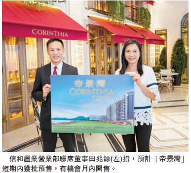 【香港商報訊】信置(083)旗下將軍澳「帝景灣」有望於本月內開售,信置項目營業部聯席董事田兆源昨日表示,預計「帝景灣」短期內有機會獲批預售樓花同意書,最快月內開售,首批將推出不少於110個單位。項目展銷廳設於尖沙咀中心,屆時將提供兩個經改動(兩房及三房)示範單位,以及三個交樓標準單位。