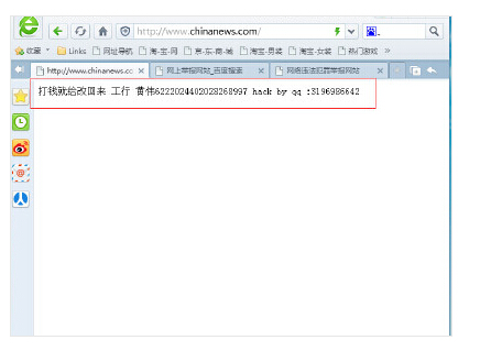 6月3日23時許,中國新聞網疑似遭受黑客攻擊,登錄域名不但無法顯示官方主頁,還會彈出“打錢就給改回來 ”,并附上賬號和QQ號。約半小時以后,網頁恢復正常。