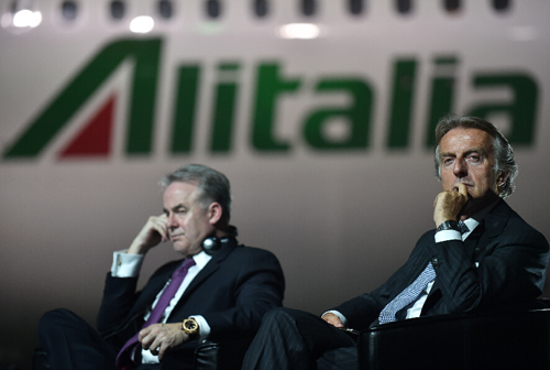 意大利航空公司董事长、前法拉利董事长蒙特泽莫罗(右)在罗马出席发布仪式。