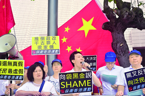 「保卫香港运动」约20多名成员,昨早於尖沙咀文化中心外附近举行「我要『一人一票』选特首」集会,高呼「一票在我手、我要选特首」、「普选无真假、泛民最虚假」等口号。该政团指出,集会目的是支持政府提出的政改方案,并称普选行政长官是香港民主进程的一大进步,落实普选不仅能确保日後施政顺利,更将令香港繁荣稳定。他们更指,在全国人大「831」框架下,普选制度仍有优化空间,盼议员能「先接受,再慢慢详细研究」,而非一步登天。