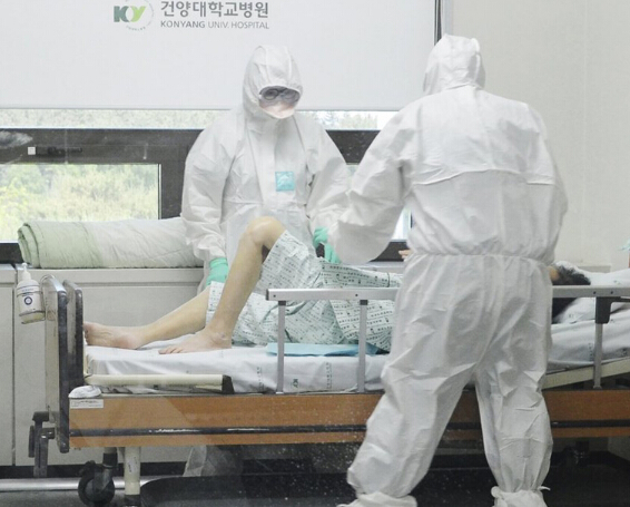 6月8日,韓國太田,醫護人員全副防護服檢查一位病人是否患上MERS。