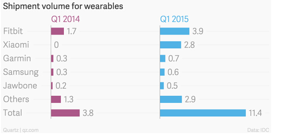 IDC公布的數據顯示,2015年第一季度,Fitbit、小米和Garmin是全球前三大可穿戴設備廠商。不過,蘋果今年4月開始銷售Apple Watch。因此當第二季度數據發布時,蘋果將躋身這一排行的前列。
