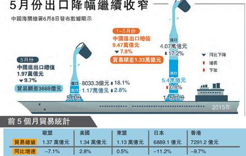 【香港商报网讯】海关总署昨日公布的数据显示,5月外贸进出口同比双双下降,虽出口降幅收窄,但进口跌幅远超预期,为连续第七个月下跌,贸易顺差大幅扩张。此外,今年前5个月,内地进出口总值9.47万亿元人民幣,比去年同期下降7.8%。分析人士预计,鉴于全球需求不足、人民幣汇率坚挺、企业生产成本上升等因素,二季度内地外贸形势仍不乐观,但随着各地稳外贸政策落实,下半年或有一些积极的变化,全年外贸或呈前低后高的走势。